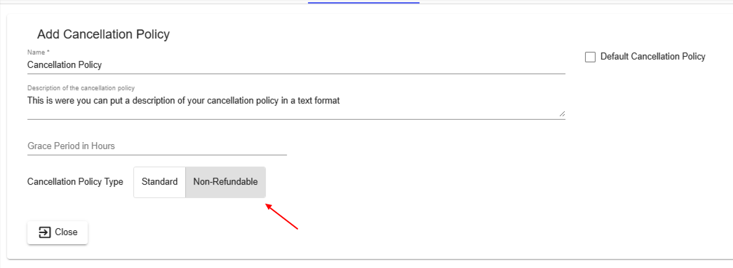 Cancellation policy can be setup as a Standard cancellation policy or a Non-Refundable cancellation policy.