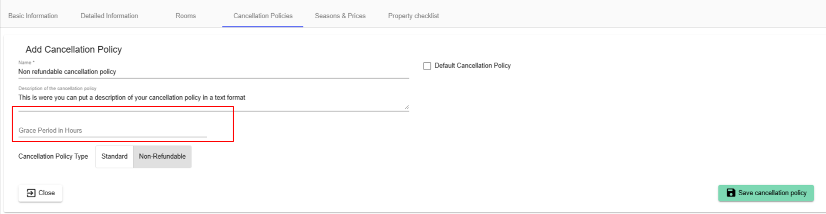 For example if a travel agency will create a booking for the following day. An hour after it was created the travel agent realizes it needs to cancel the newly created booking, since the grace period is valid, no cancellation fee will be applicable for the booking. If a grace period is not activated then normal cancellation policy will apply. In this case the property can charge a 100% fee since the cancellation was done after the 48 hour window.