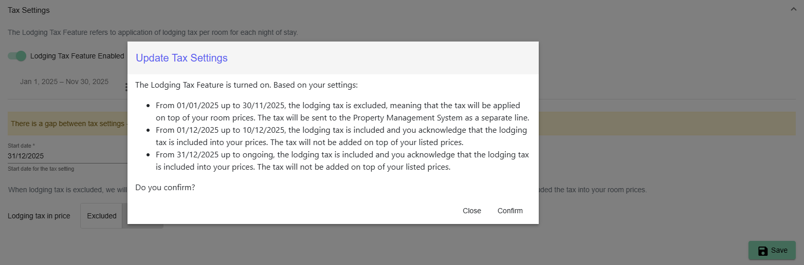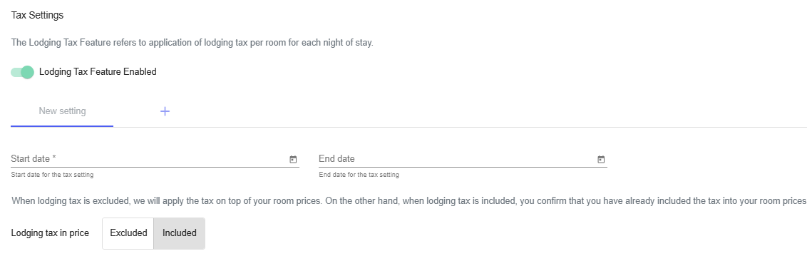 - If the lodging tax is included in your prices, click on Included and click on Save. If you choose this option, a message in the booking process states that the lodging tax is included in the room price.