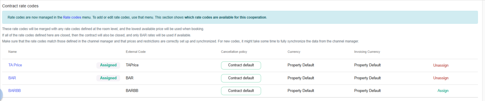 On the contract level the rate codes shown are available for the cooperation and need to be assigned.