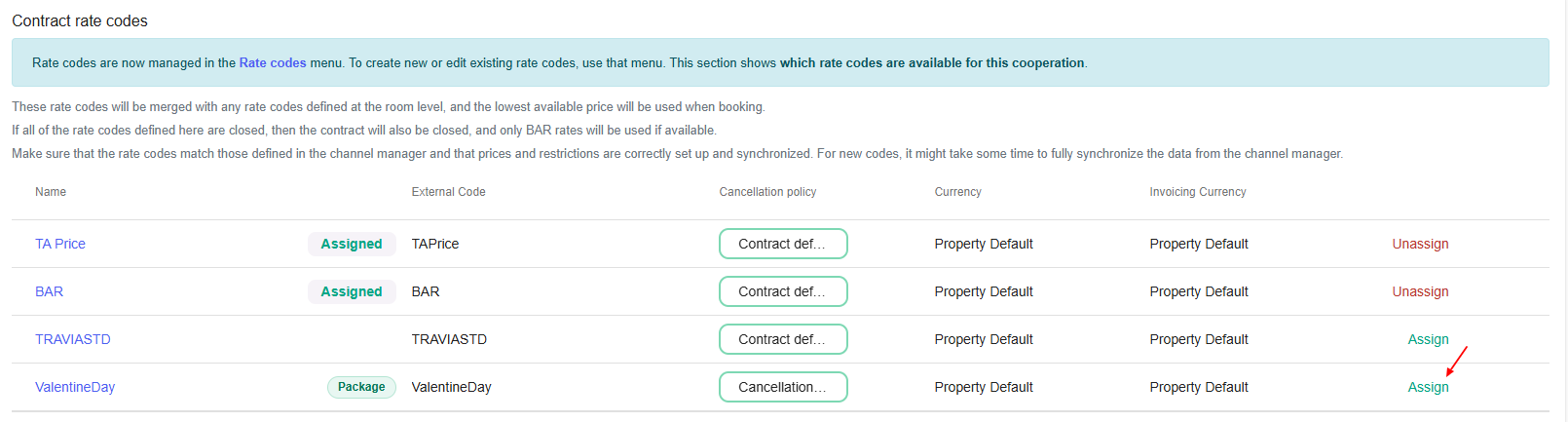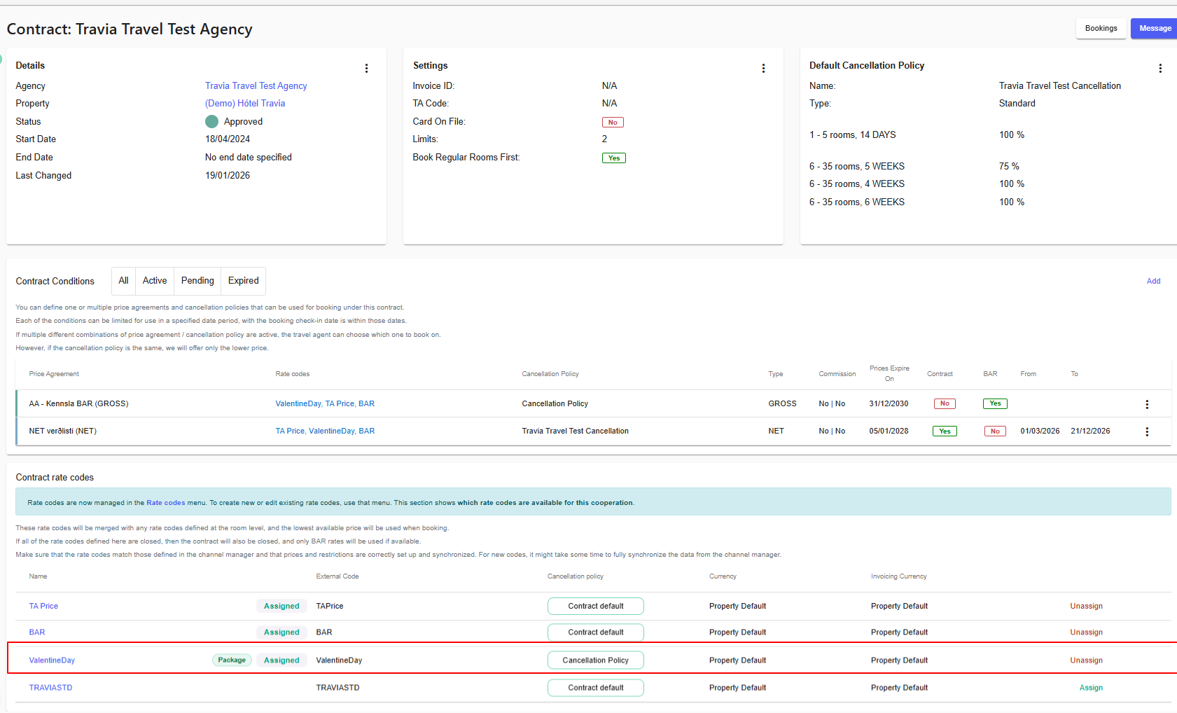 To give the travel agency an option to book the package you can either assign it to all contracts or choose which travel agency is applicable. Open a specific cooperation with a travel agency and manually assign the applicable rate code to their contract.