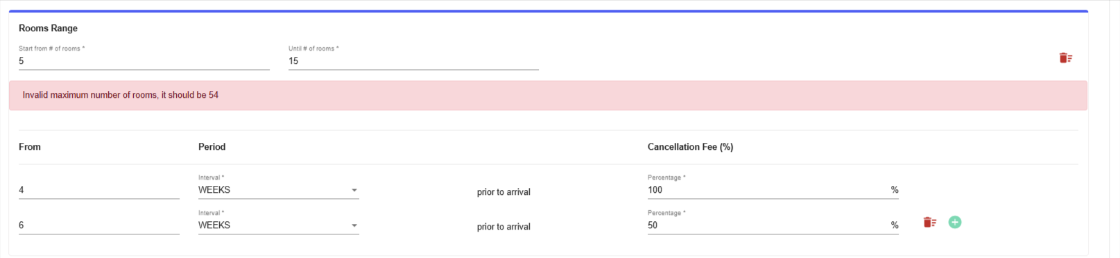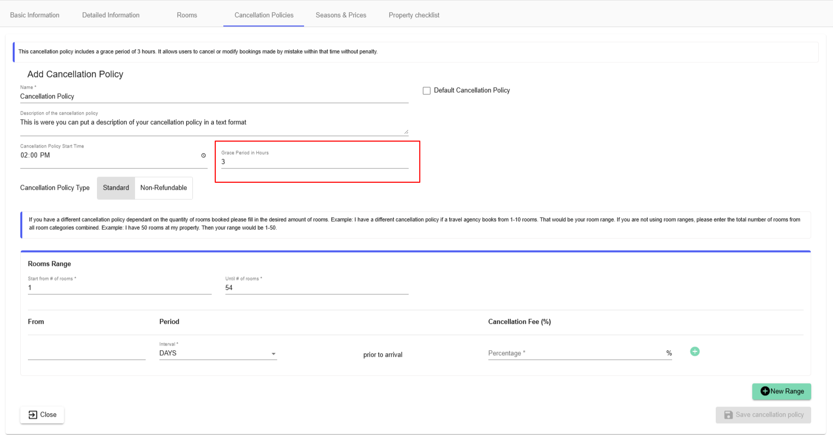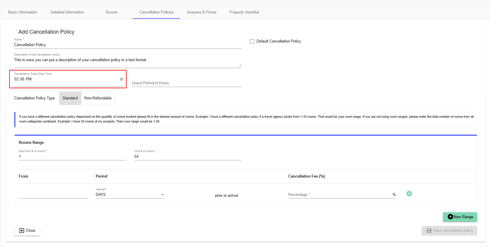 Ef þú vilt setja upp mismunandi skilmála byggt á fjölda herbergja og fyrirvara þá er ýtt á New Range. Mikilvægt er þá að hafa í huga hvaða stilling á að vera fyrir fyrst, hægt að hugsa um þá stillingu sem FIT og svo fjölbreytilegri skilmálar fyrir hópa.
